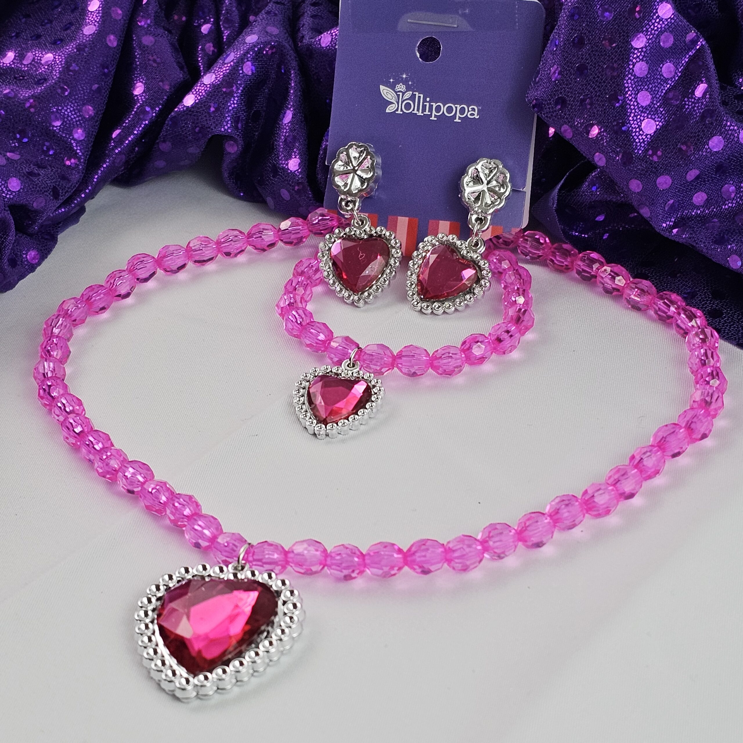 Grab this Lollipopa® Princess Jewelry Set in the color razzleberry! This delightful set is perfect for the stylish young one aged 3 to 9, ready to sparkle and shine at any playful occasion. The set includes sparkling clip-on earrings, a shimmering bracelet, and a dazzling necklace with a pendant. Each piece features the bold magenta hue of razzleberry that brightens every dress-up adventure.